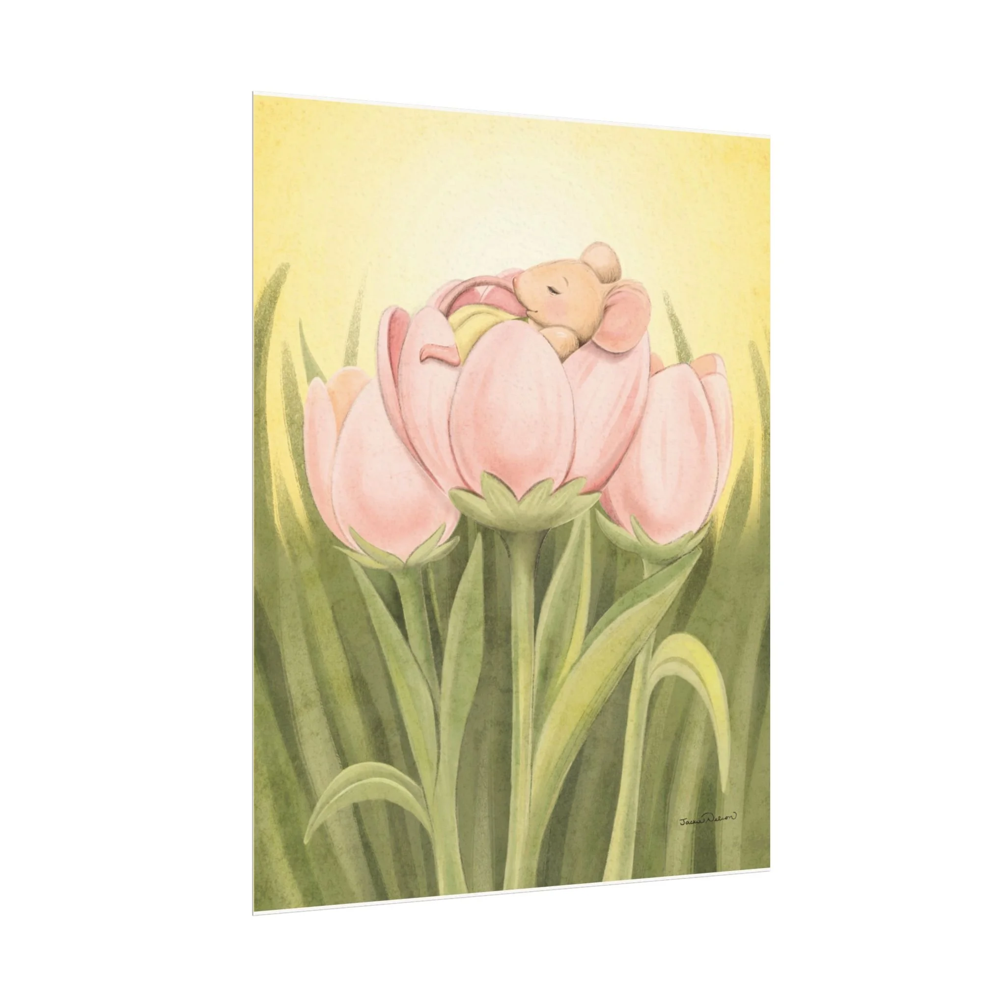 This beautiful print features Emerald Orchard's quiet mouse Aster Honeytail asleep in a tulip. A lovely addition for springtime, a nursery, or anywhere you can dream up.
